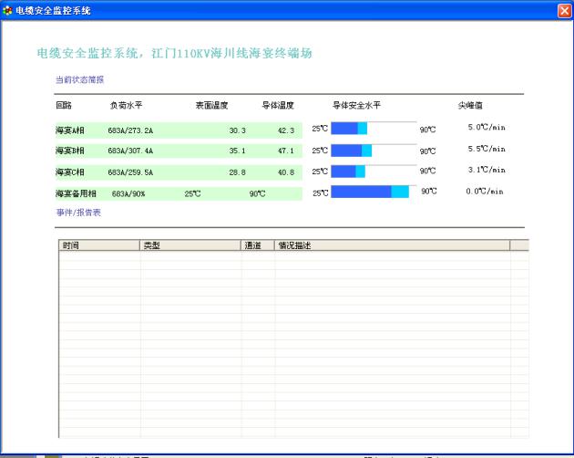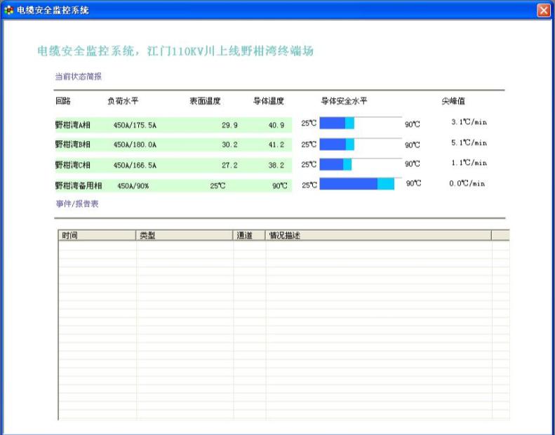 電纜回路狀態(tài)列表,包括電纜負(fù)荷水平,表面溫度,最高導(dǎo)體溫度,導(dǎo)體安全水平,尖鋒值;