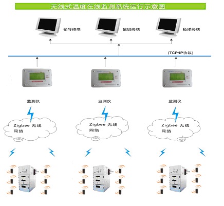 無線測溫系統(tǒng)主要有由無線溫度顯示儀、無線溫度傳感器、后臺監(jiān)控軟件組成。通過分布式安裝在現(xiàn)場的無線溫度傳感器采集溫度信息,然后將溫度信息以無線通訊的方式發(fā)送至接收主機,分析處理、集中顯示。通過組網(wǎng)亦可連接至后臺軟件系統(tǒng),實施遠程在線監(jiān)測。系統(tǒng)具備完善的用戶管理、越限報警、歷史記錄、曲線查看等功能。