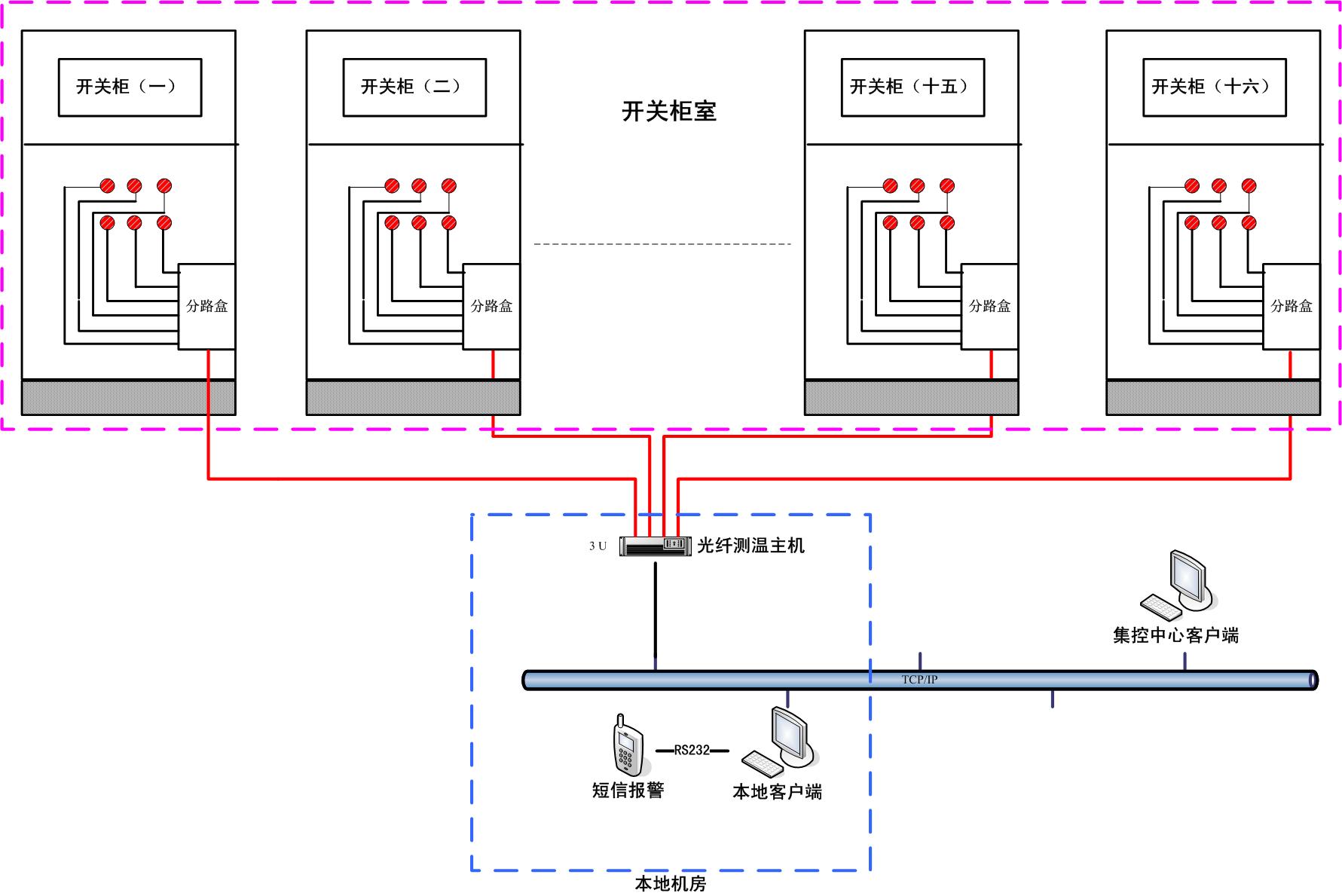 為此,迅捷光通科技有限公司基于光纖測(cè)溫傳感技術(shù),適時(shí)地開發(fā)出光纖光柵感溫火災(zāi)探測(cè)系統(tǒng),實(shí)時(shí)對(duì)開關(guān)柜進(jìn)行溫度監(jiān)測(cè),并進(jìn)行預(yù)警和報(bào)警。該系統(tǒng)采用了全光纖傳感無源測(cè)溫方式,消除了監(jiān)測(cè)系統(tǒng)自身的安全隱患,極大提高了監(jiān)測(cè)系統(tǒng)對(duì)電力溫度監(jiān)測(cè)的可用性。該光纖測(cè)溫系統(tǒng)被很多電廠和供電公司使用,大大降低了火災(zāi)事故的發(fā)生,真正地做到防患于未然,符合電力行業(yè)“安全第一,預(yù)防為主”的安全思想。